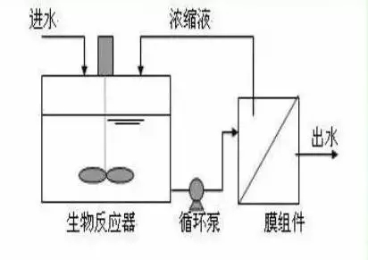 把膜組件置于生物反應器內部。進水進入膜--生物反應器,其中的大部分污染物被混合液中的活性污泥去除,再在外壓作用下由膜過濾出水。