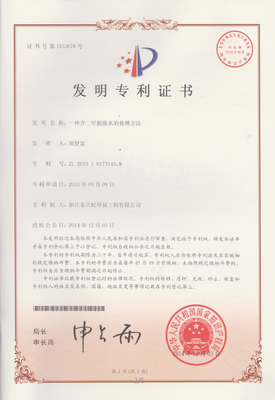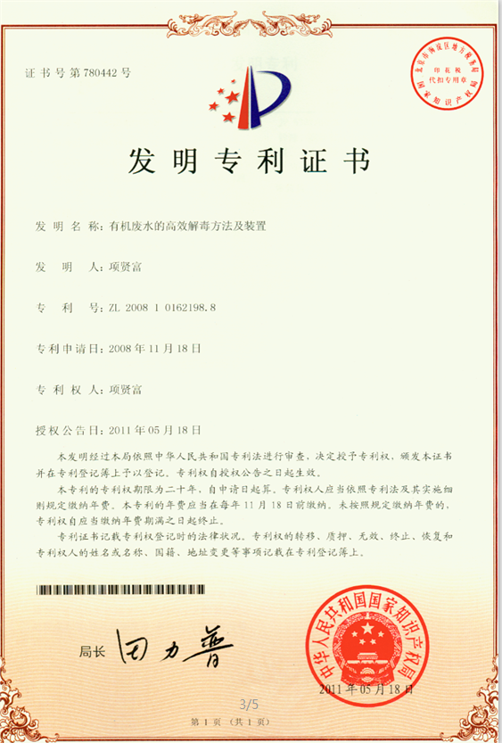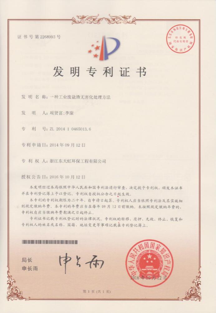 通過不斷的自主研發和積累,繼發明專利有機廢水的高效解毒方法及裝置、一種含二甲胺廢水的處理方法后,公司又獲得第三項專利 :一種工業廢鹽渣無害化處理方法。