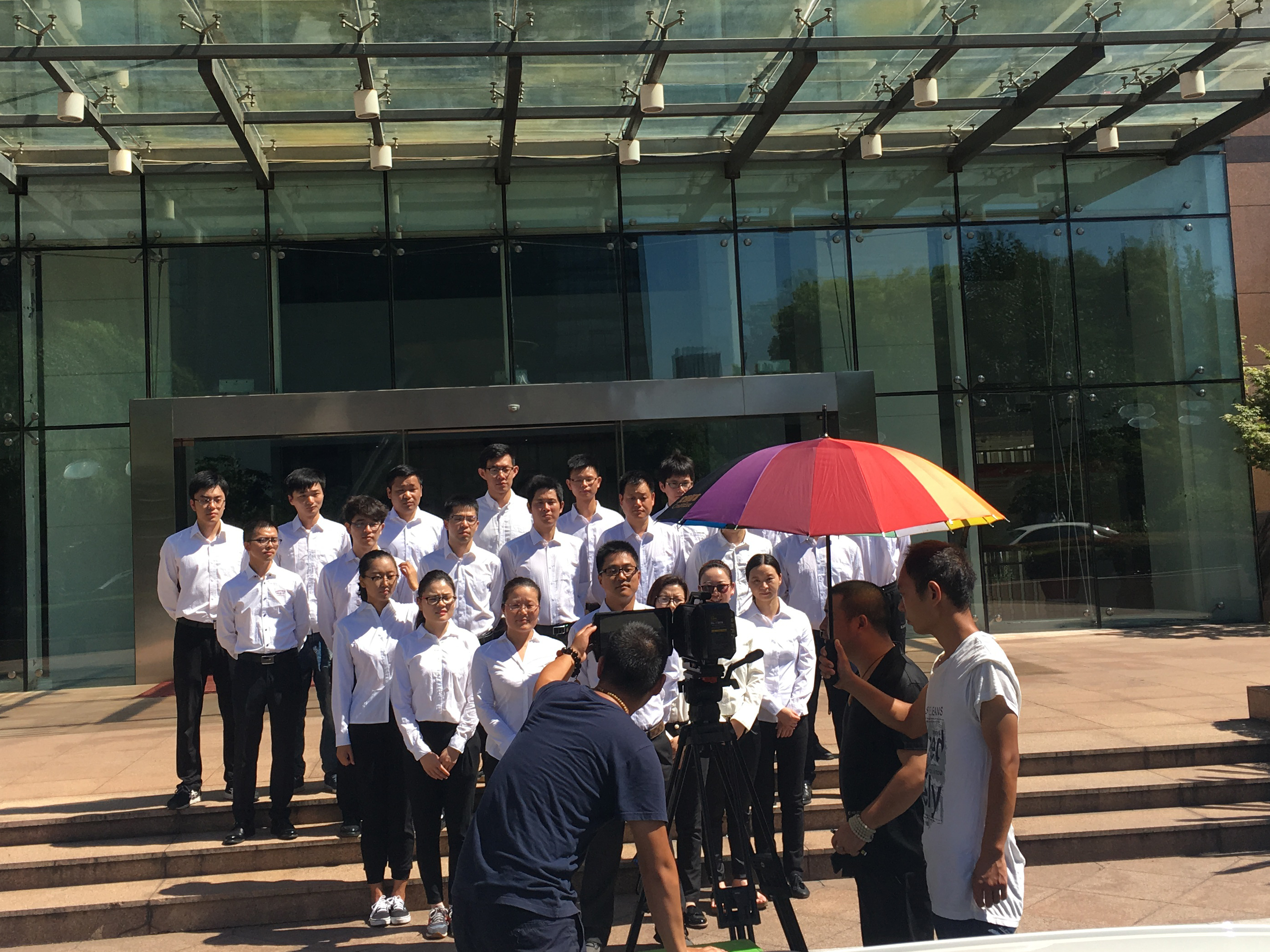 當天上午一大早,同事們已經做好了拍攝的準備工作,換好衣服,化好妝,長發扎起。雖是早上,太陽的威力可一點不弱,同事們長衣長褲站在太陽底下,從鏡頭里看起來很專業干練,但那滋味真是——誰曬誰知道,雙眼皮里都是汗水。在太陽下站一會兒,就覺得皮膚發燙,加上穿著黑色長褲黑皮鞋,格外吸熱。