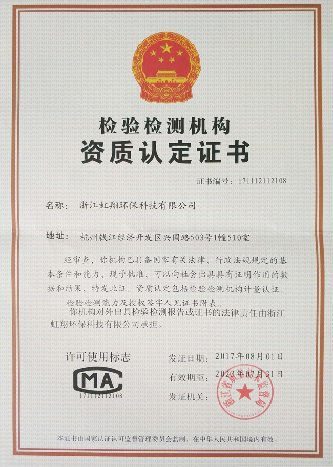 2017年81日東天虹下屬全資子公司——浙江虹翔環(huán)保科技有限公司收到了來自浙江省質量技術監(jiān)督局的計量認證證書,這意味著浙江虹翔環(huán)保科技有限公司正式通過了中國計量認證(CMA)的認可。
