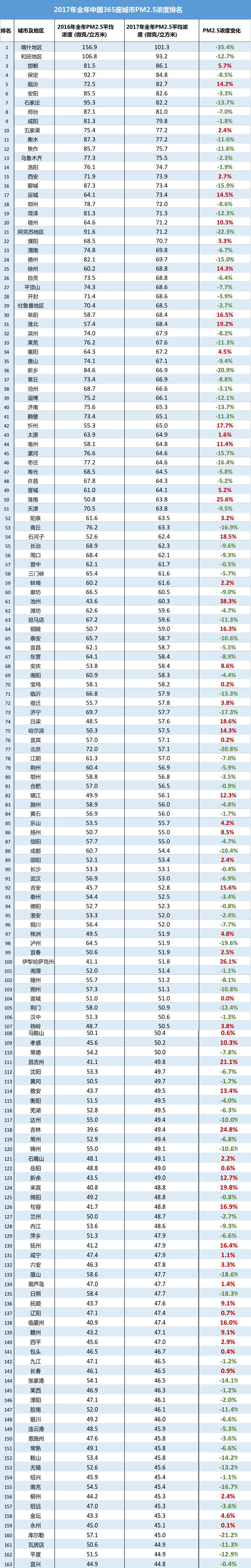 根據(jù)環(huán)保部公開數(shù)據(jù),我們對全國365座城市的年平均PM2.5數(shù)據(jù)做了一個排名。