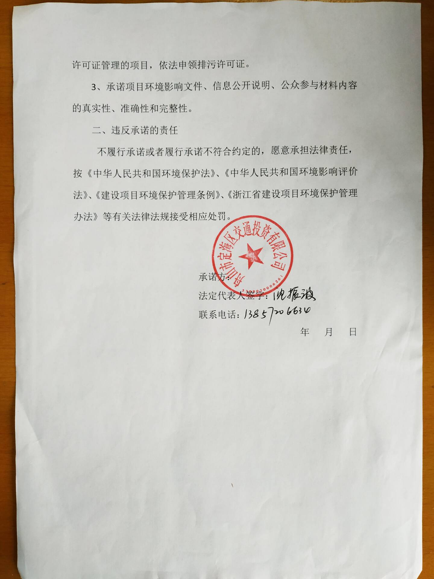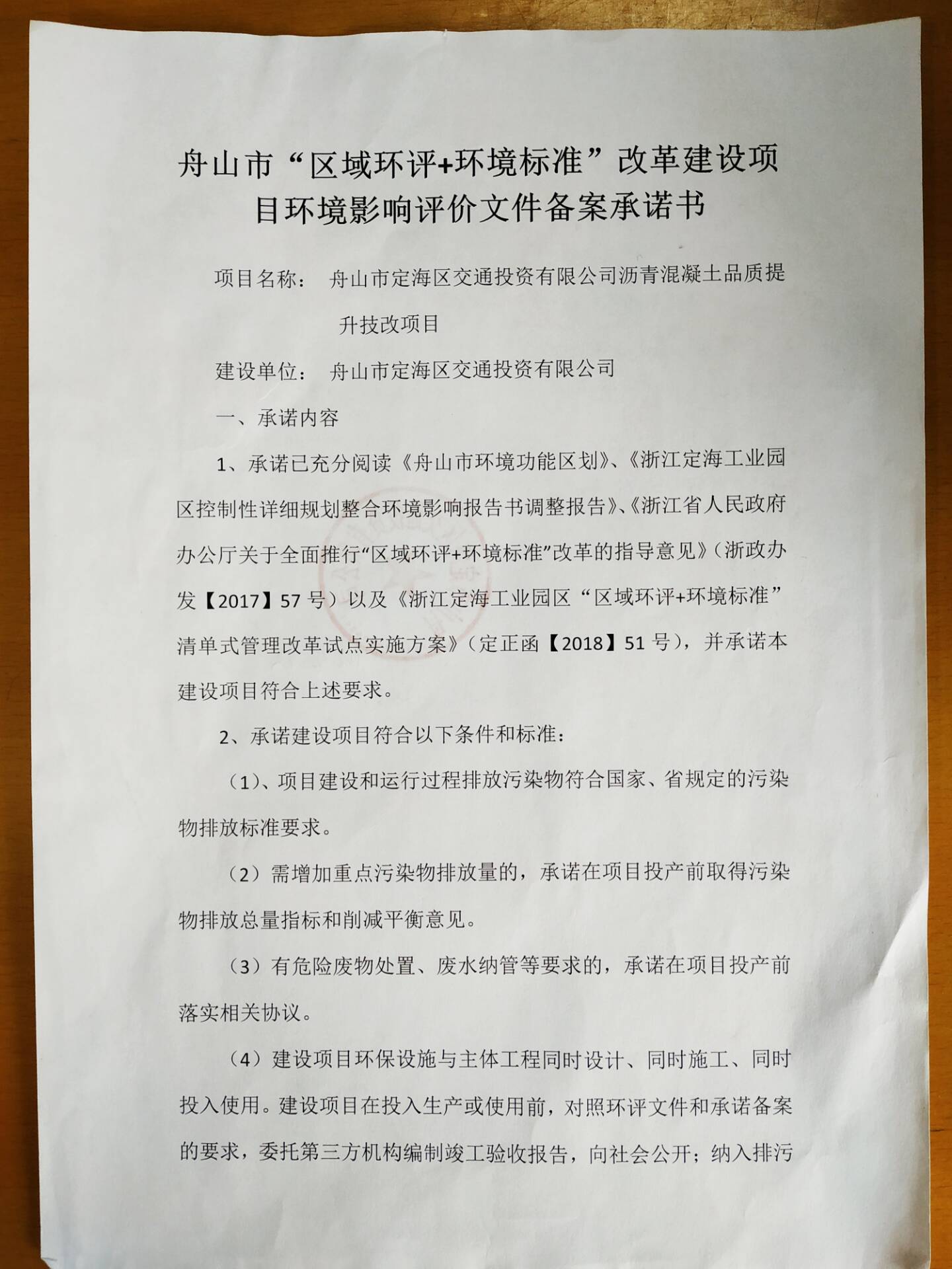 舟山市定海區交通投資有限公司瀝青混凝土品質提升技改項目”區域環評+環境標準“改革建設項目環境影響評價文件備案承諾書