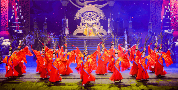 今天的任務就是吃吃喝喝玩玩樂樂。酒足飯飽之后欣賞了氣勢恢宏的演出,室內的“傾盆大雨”、屋頂緩緩落下的美倫美奐的蓮花燈、乘著鳳輦從空中翩翩而來的西施,騎著白馬現身的楚王勾踐,無不讓人意外又驚喜。