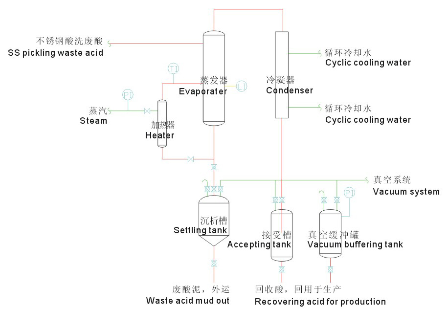 不銹鋼生產廢酸再生回用 Stainless Steel Waste Acid Regeneration And Re-use 技術指標: (1)廢酸成分:Fe3+ 25~40g/L,Ni2+2~2.9/L,Cr6+ 3~4g/L,NO3- 2.3,ol/L,F- 1.6mol/L。 (2)回收指標(回收率):HNO393%~96%,HF94%~96%,HCL~70%。 Technical indexes 1) Consitituents of waste acid:Fe3+ 25~40g/L,Ni2+2~2.9/L,Cr6+ 3~4g/L,NO3-2.3mol/L,F-1.6mol/L. 2)Recovering indexes(recover rate):NHO3 93%~96%,HF94%~96%,HCL~70%. |