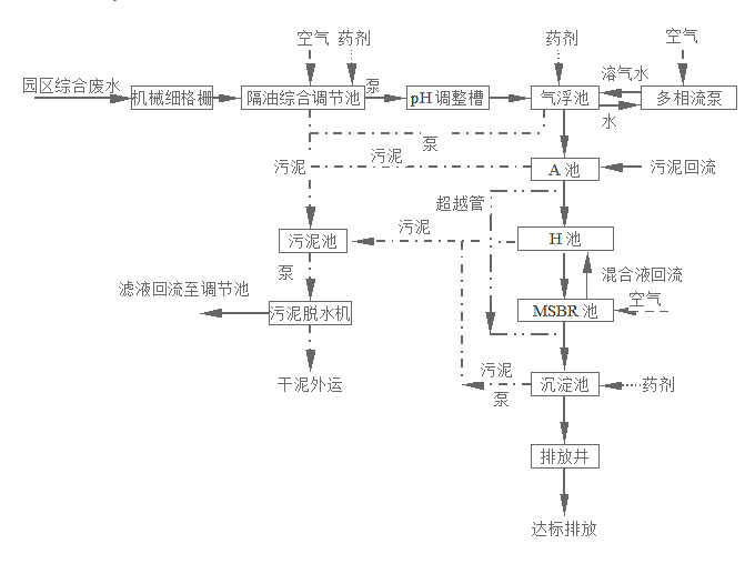 園區(qū)污水經(jīng)泵站分別送入細格柵井,經(jīng)細格柵除去較大雜質(zhì)后進入隔油調(diào)節(jié)池,池前端設(shè)置隔油板除去部分浮狀物質(zhì)及油污,調(diào)節(jié)池內(nèi)設(shè)曝氣充氧,并投入一定量中和劑和鐵鹽物質(zhì),污水在調(diào)節(jié)池得到均質(zhì)和部分改性后由泵提升至氣浮池,氣浮池單獨設(shè)pH調(diào)整槽,在pH調(diào)整槽內(nèi)通過精確投加中和劑(堿液),確保pH在7~9進入氣浮池,投加混凝劑和助凝劑,在溶氣水的作用下使廢水的SS、油脂和部分COD得到去除,為后續(xù)生化處理創(chuàng)造條件。氣浮池出水自流進入A池,A池內(nèi)設(shè)潛水?dāng)嚢铏C,并安裝有組合填料,微生物在缺氧的條件下附著在填料上生長,借助厭氧菌的作用,大部分可降解的有機物厭氧分解,部分難降解的大分子有機物分解為可生物降解的小分子。A池中設(shè)折流隔板和水下攪拌機,保持了泥水的充分混合,A池出水自流進入MSBR池。MSBR前端為H段,通過兼氧菌和好氧菌的作用,使有機物得到較徹底地分解,同時通過混合液回流至H段實現(xiàn)反硝化,完成生物脫氮,好氧部分生化剩余污泥由SBR池排向污泥池。