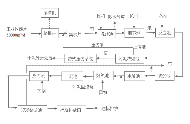 廢水經(jīng)格柵隔去粗大雜物后進(jìn)入集水井,通過水泵提升廢水至曝氣沉砂池,經(jīng)去除沉砂后廢水進(jìn)入調(diào)節(jié)池,調(diào)整pH后再通過泵均勻提升到反應(yīng)初沉池,經(jīng)投加混凝劑及助凝劑使廢水中所含的大部分SS、部分色度和CODcr,出水進(jìn)入水解池,在缺氧狀態(tài)下使雜環(huán)偶氮類染料大分子有機(jī)物經(jīng)水解分解成小分子有機(jī)物,提高廢水的可生化性,水解池出水進(jìn)入好氧池,廢水在好氧池內(nèi)借助好氧微生物作用使大部分有機(jī)物徹底降解,混合液進(jìn)入二沉池,經(jīng)泥水分離后,二沉池出水進(jìn)入反應(yīng)混凝終沉池,通過投加相應(yīng)的混凝脫色劑和助凝劑,使污水達(dá)標(biāo),最終出水經(jīng)排放口計(jì)量后排海。污泥則經(jīng)濃縮池濃縮后并由脫水機(jī)械脫成干泥餅后外運(yùn)做無害化處置。